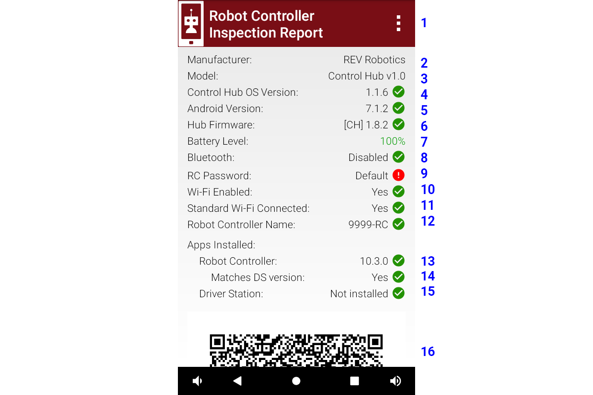 Driver Stationshould be Not installed, this verifies that the Robot Controller device does not also have a Driver Station app installed. Only one FTC app should be installed on each device. It’s possible to accidentally install both apps, but this usually causes the apps to not work properly.Item 16 At the bottom of the RC inspection report is a QR Code that can be scanned during field inspection to fill in many of the field inspection checklist items.